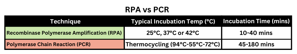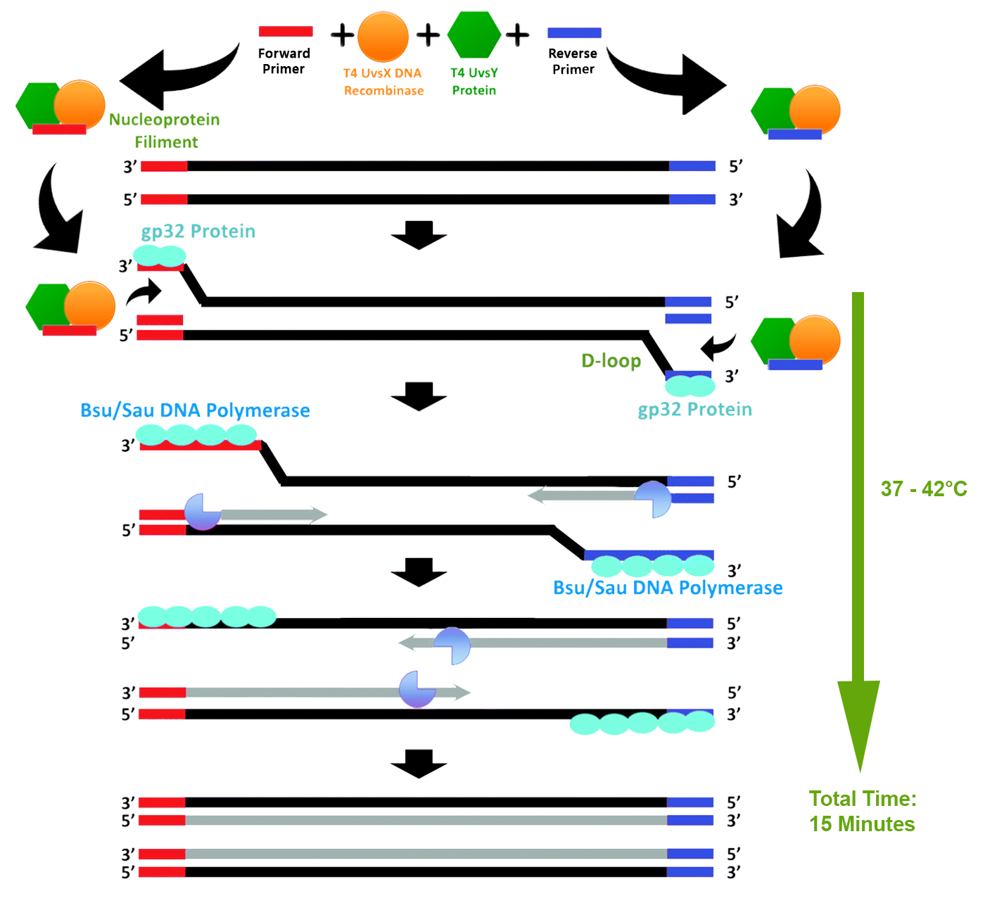 Recombinase Polymerase Amplification (RPA) amplifies DNA at a constant temperature (37-42 °C) using a recombinase (e.g. UvsX), primers, a single-stranded DNA binding protein (SSB), and a strand displacing DNA polymerase. T4 UvsX is used in combination with its accessory protein, UvsY. The recombinase interacts with the primers to form nucleoprotein filament. This complex is able to bind with homologous double-stranded DNA through a strand exchange. After the exchange, a single-stranded binding protein, T4 gp32, stabilizes the displaced strand. Finally, Bsu/Sau polymerase extends the primers, creating a new complete copy of the template, and amplification can continue like Polymerase Chain Reaction (PCR).