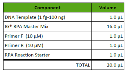 - Add the IG RPA Reaction Starter to initiate the reaction. Prepare per reaction mix according to the following table in order: