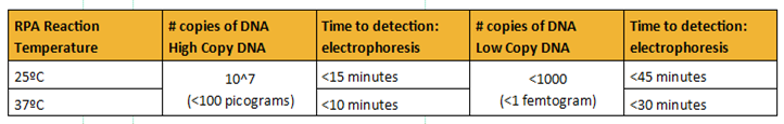 A: The IG® RPA Master Mix is a very sensitive assay and extending the time may enhance the signal for low DNA copy targets (under 1000 copies). The table below is a flexible guide to help with designing applications: