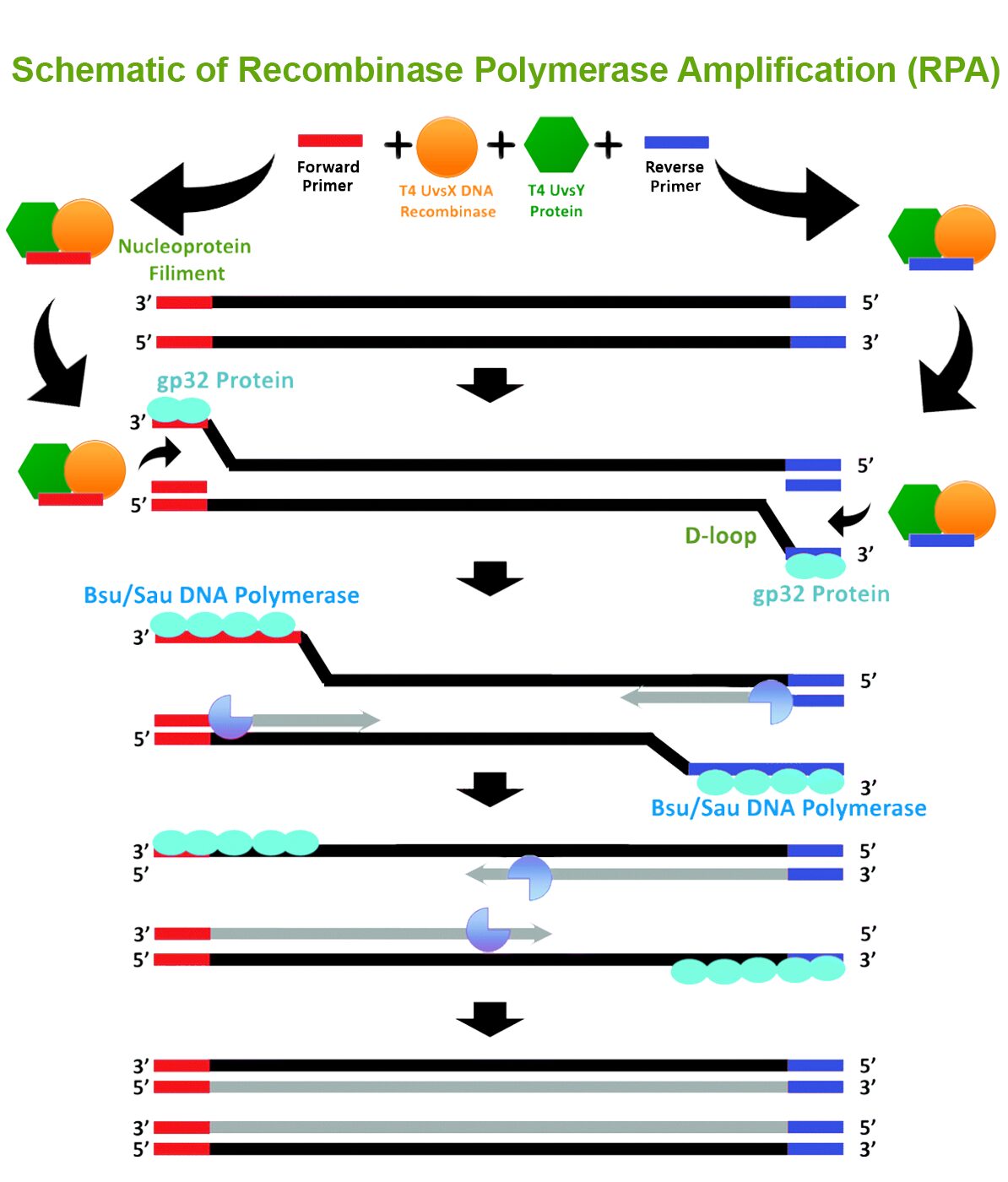IG® Recombinase Polymerase Amplification Kit Version 2 (IG® RPA V2) amplifies DNA at a single and constant temperature (25 – 42°C) using a recombinase (e.g. UvsX), primers, a single-stranded DNA binding protein (SSB), and a strand displacing DNA polymerase. T4 UvsX is used in combination with its accessory protein, UvsY. The recombinase interacts with the primers to form nucleoprotein filament. This complex can bind with homologous double-stranded DNA through a strand exchange1-3. After the exchange, a single-stranded binding protein, T4 gp32, stabilizes the displaced strand. Finally, Bsu/Sau DNA polymerase extends the DNA from the primers, creating a new complete copy of the template, and amplification can continue like in Polymerase Chain Reaction (PCR).